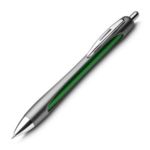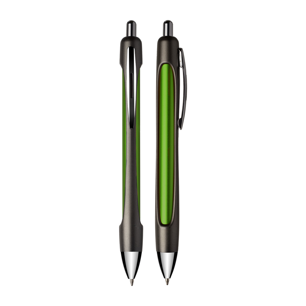 Caneta esferográfica em alumínio reciclavel com escrita em azul. Refil tipo parker.