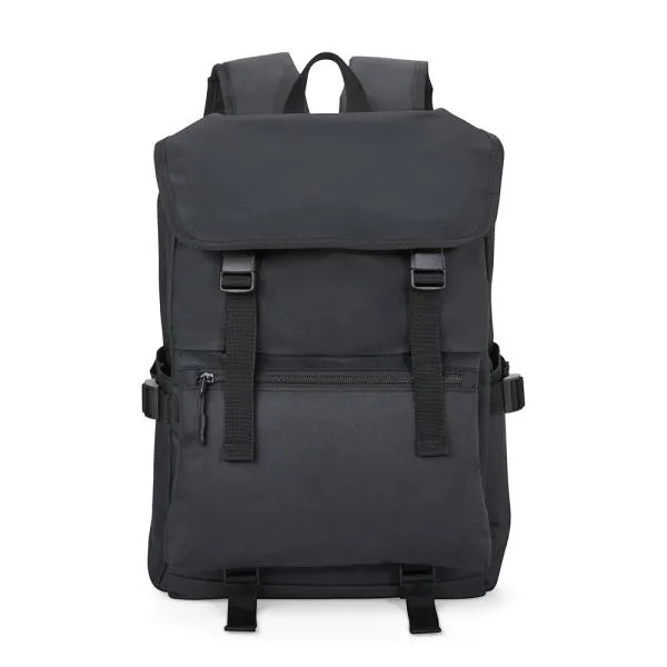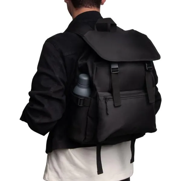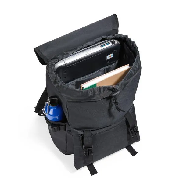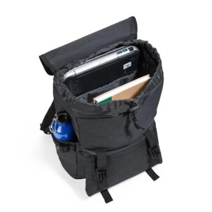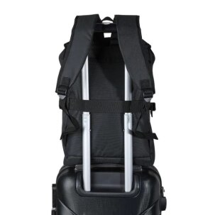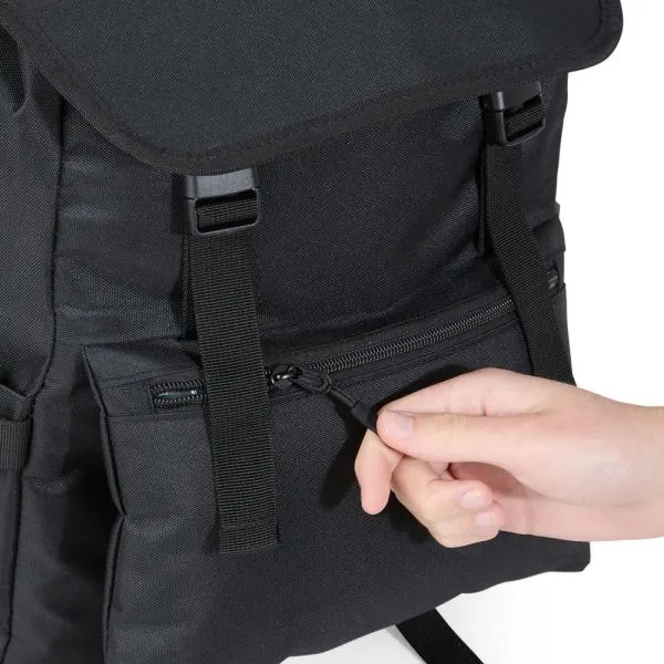 Conta com bolso principal com fechamento com cordão e aba com fecho de engate rápido, bolso frontal com ajuste, 2 bolsos laterais com ajuste para controlar o volume da mochila, alças ajustáveis, alça de mão e alça carona para mala. Espaço interno com divisória para notebook com acabamento acolchado.
